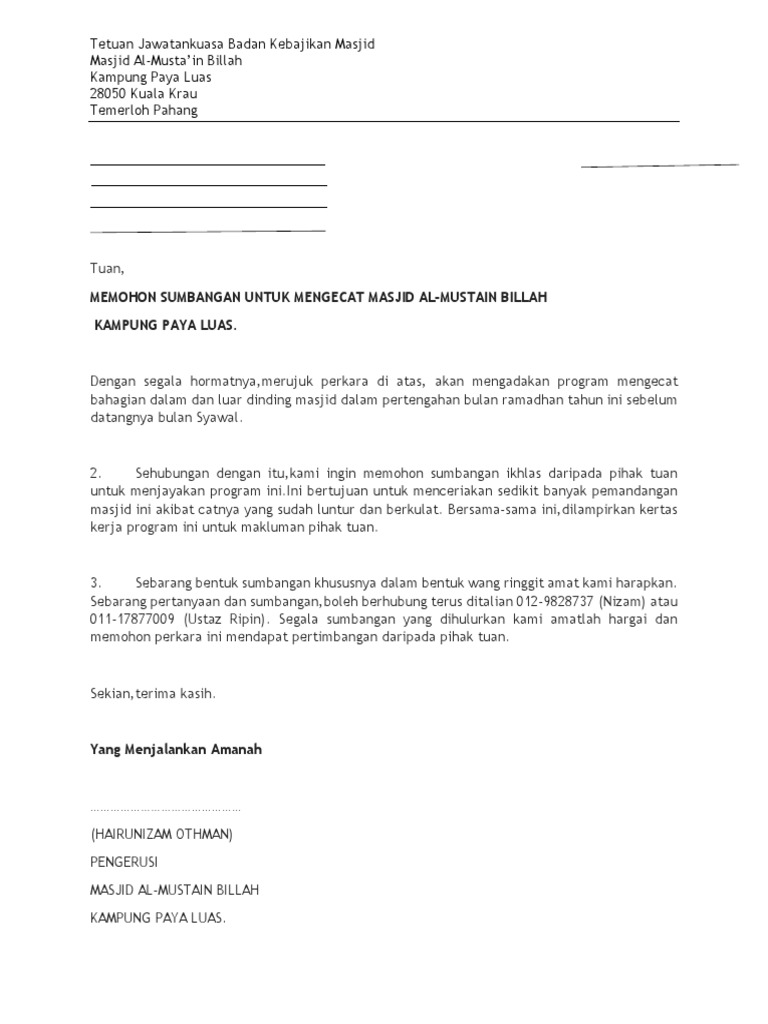 Salah satu faktor yang biasanya sering menjadi kendala adalah masalah yang berkaitan dengan finansial atau. Begitu juga di hari sukan, selalunya pihak sekolah akan memohon tajaan dari syarikat minuman seperti nestle, milo. Memohon sumbangan & derma ikhlas pembangunan kompleks tahfiz mutmainnah. Contoh surat memohon sumbangan derma pembangunan surau alfirdaus taman garing utama, rawang, selangor. Contoh surat mohon sumbangan ini adalah salah satu contoh surat memohon sumbangan derma atau dana.